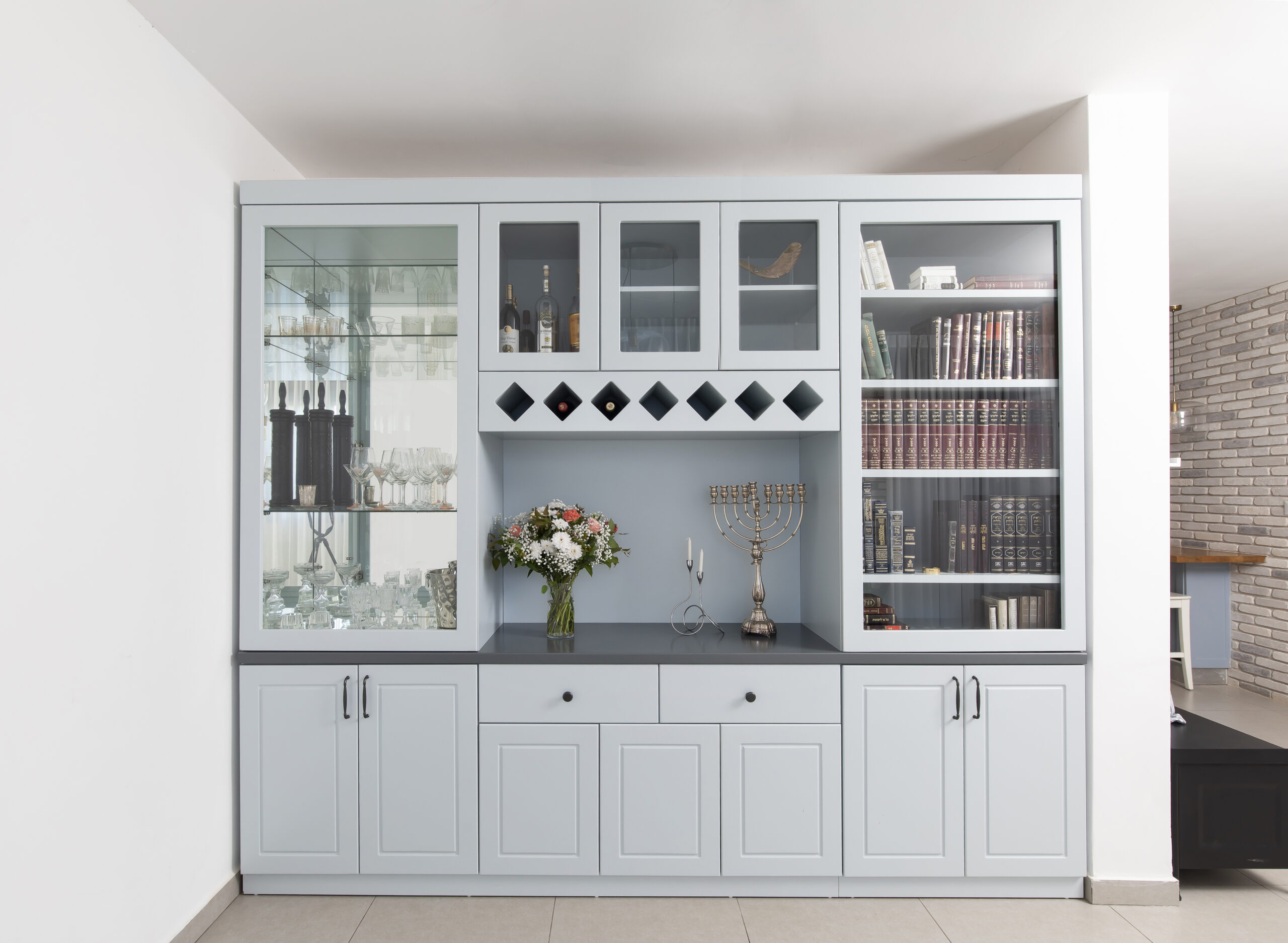 מפה לשם המשכנו את תהליך העצוב גם לאזור הסלון ומאחר ולא נדרשה טלויזיה בבית ביטלנו חדר שהיה צמוד לסלון ויצרנו חלל בו תוכננה סיפריית קודש עבור כל ספרי הקודש ושאר הפריטים שהם מחזיקים כמו חנוכייה יפייפה ומעוצבת מכסף שצריכה מקודם גם לתצוגה אך גם לשמירה.