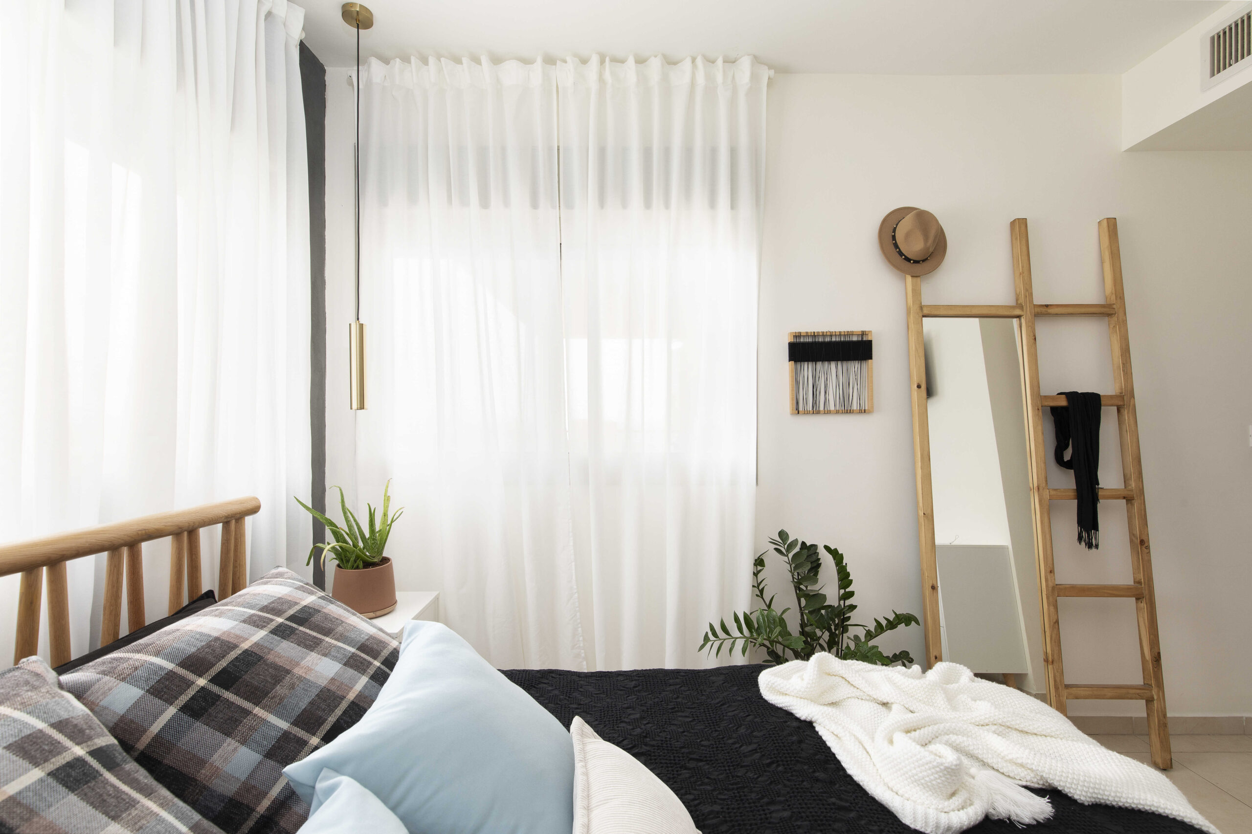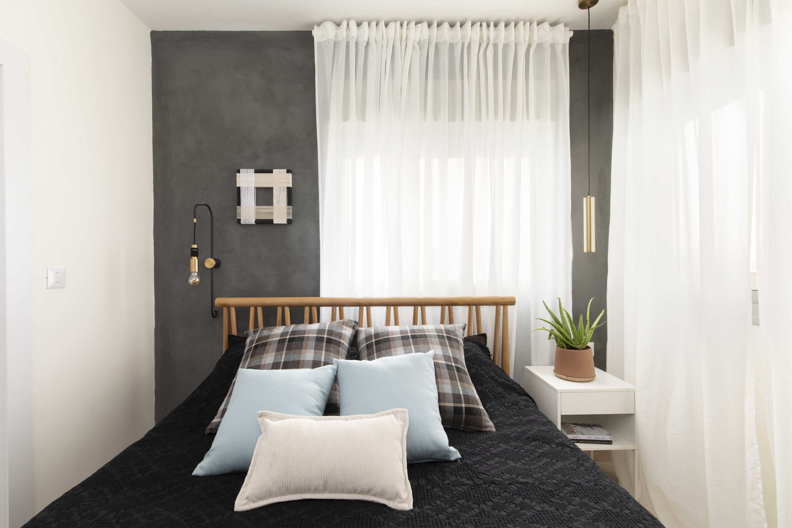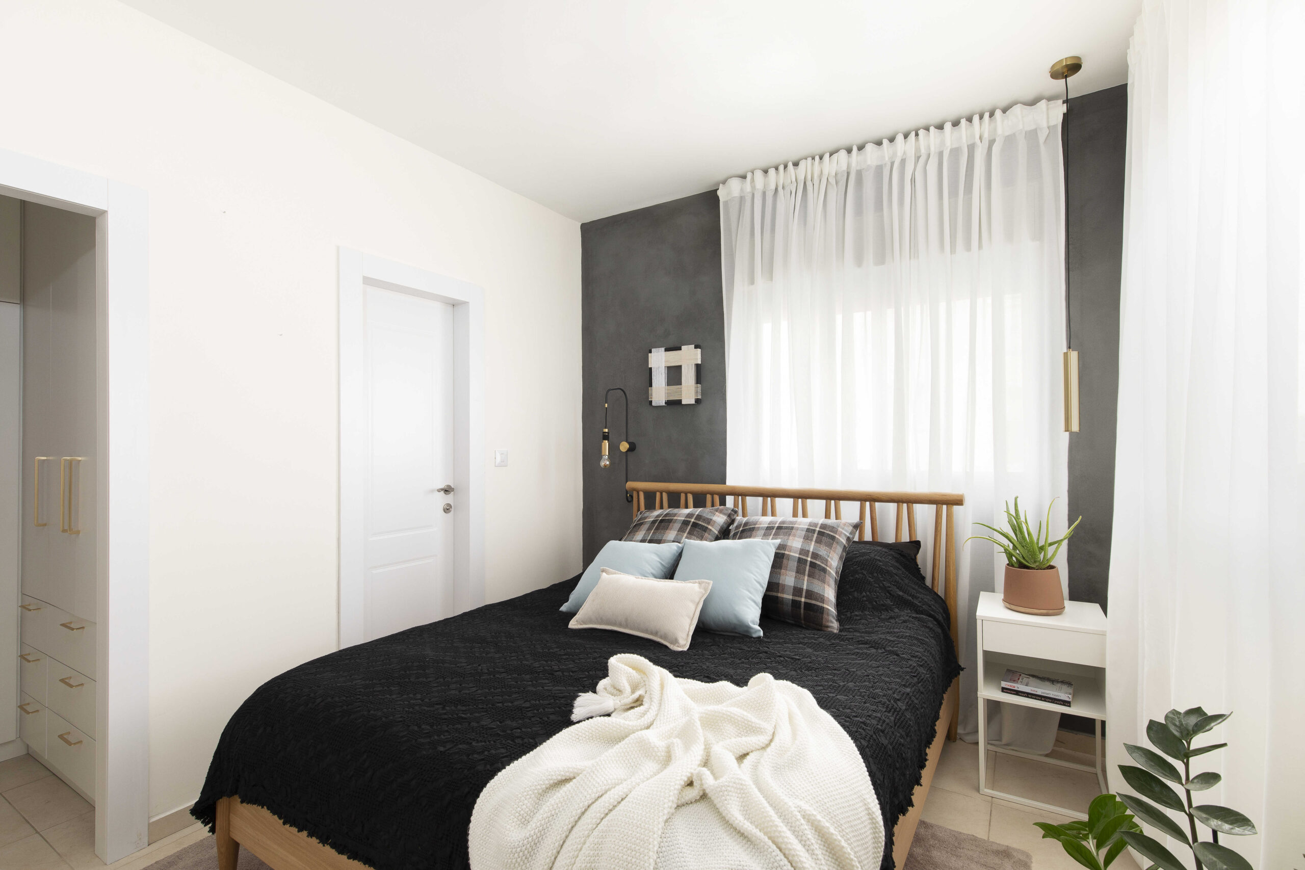 הם ביקשו חדר שינה מעט מחוספס אבל שיהיה נעים להיכנס אליו לכן לקחתי את המילה מחופספס תרתי משמע ובחרתי להם קיר גב מיטה אפור כהה בטקסטורה מחוספסת דמוי בטון אליו שילבתי אלמנטים בשחור וזהב ולכל זה הכנסתי וילון נשפך, ריהוט מעץ, כריות נוי בצבעים מעניינים, תמונות ליפופים עם קו נקי וצמחים על מנת לתת איזון לחספוס ולתת להם את ההרגשה זאת שהם ביקשו: “חדר שיהיה נעים להיכנס אליו”.