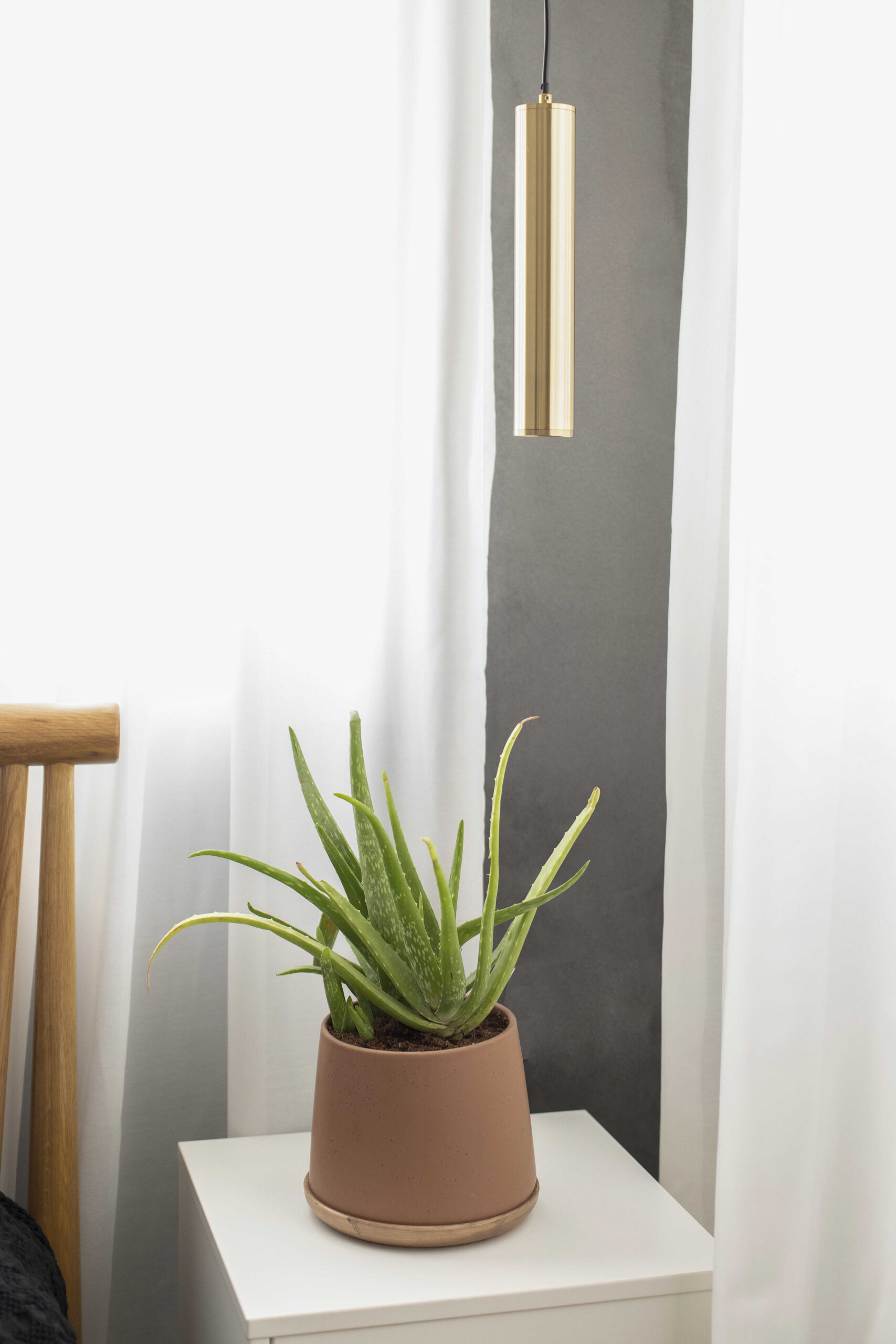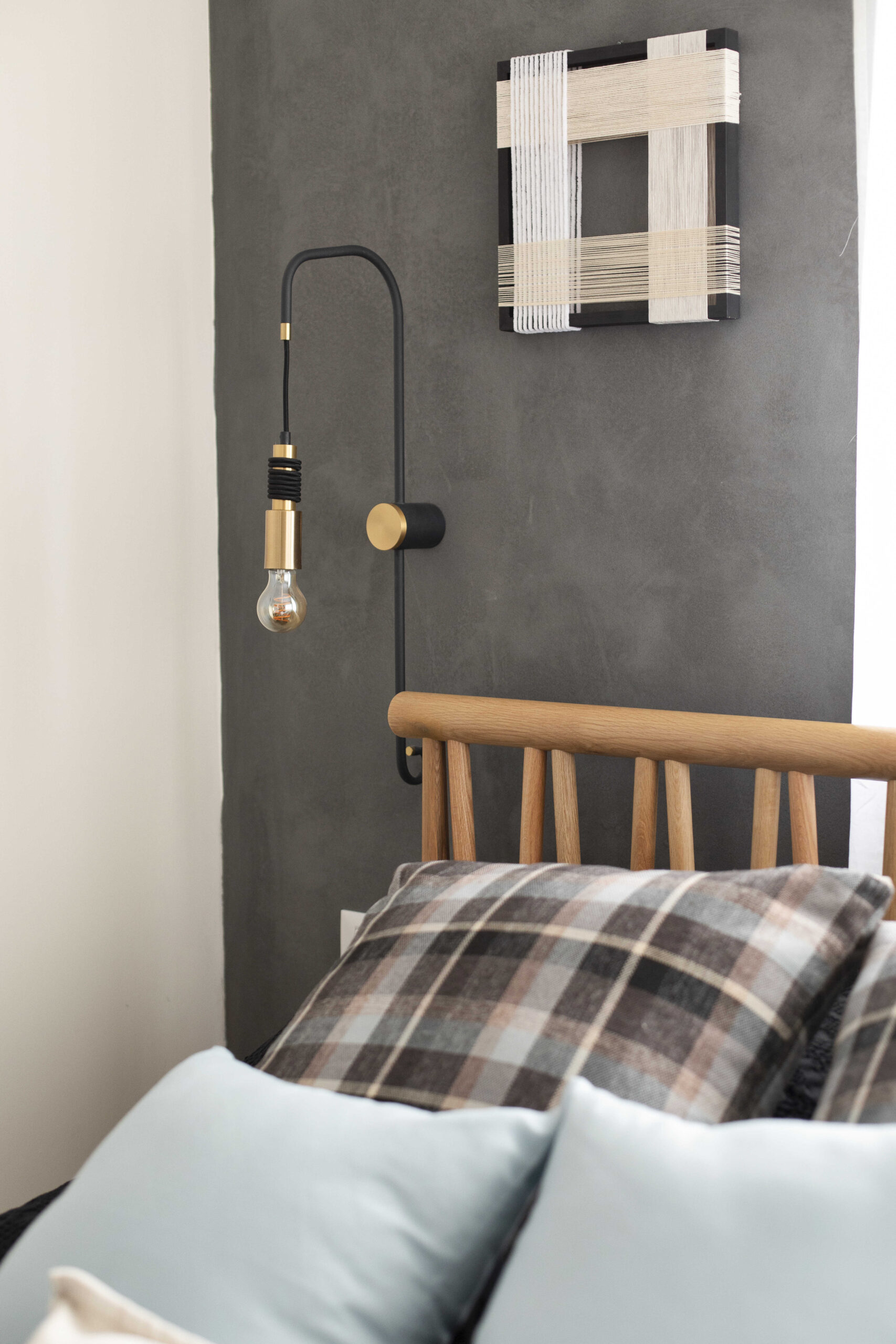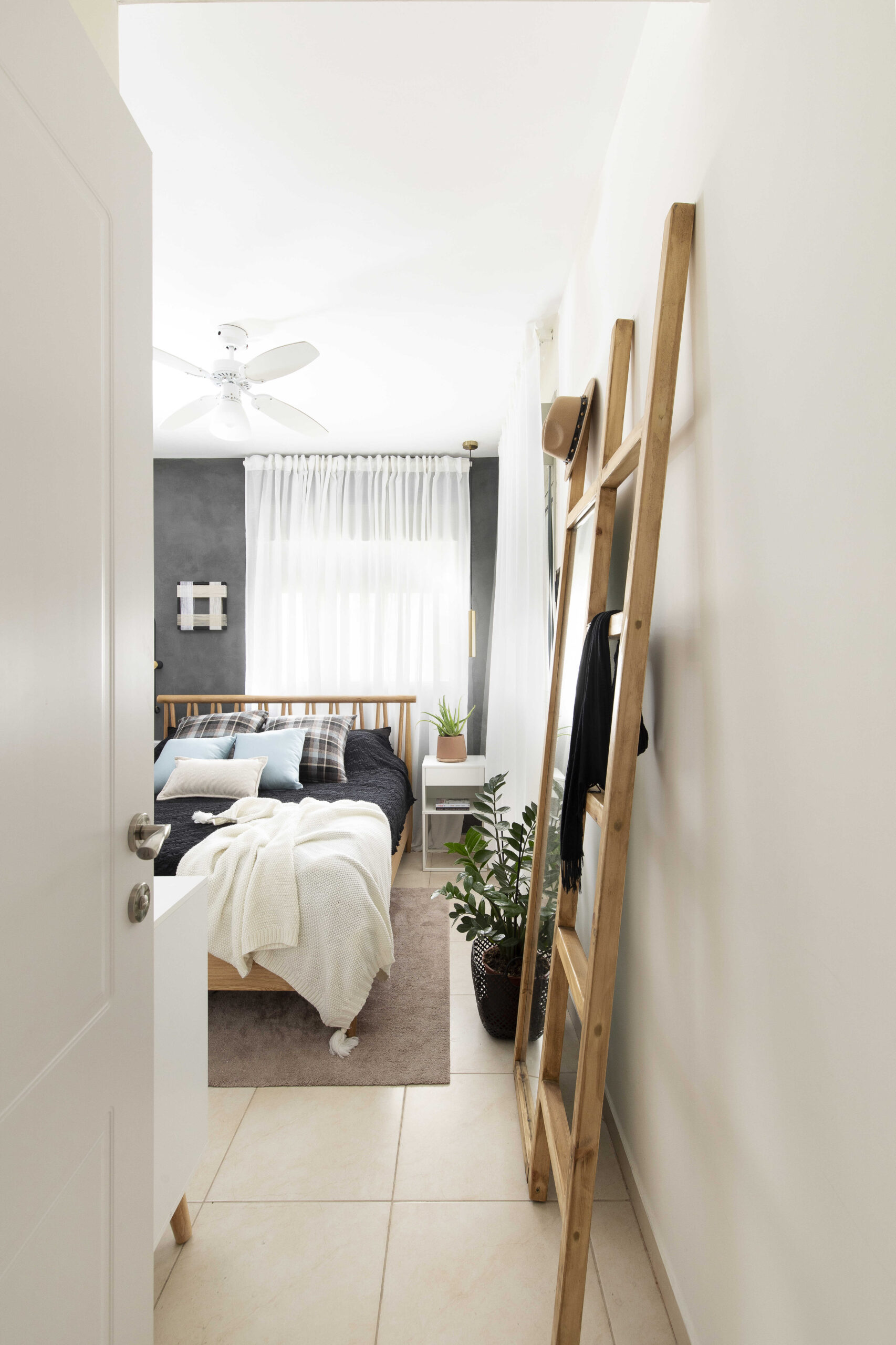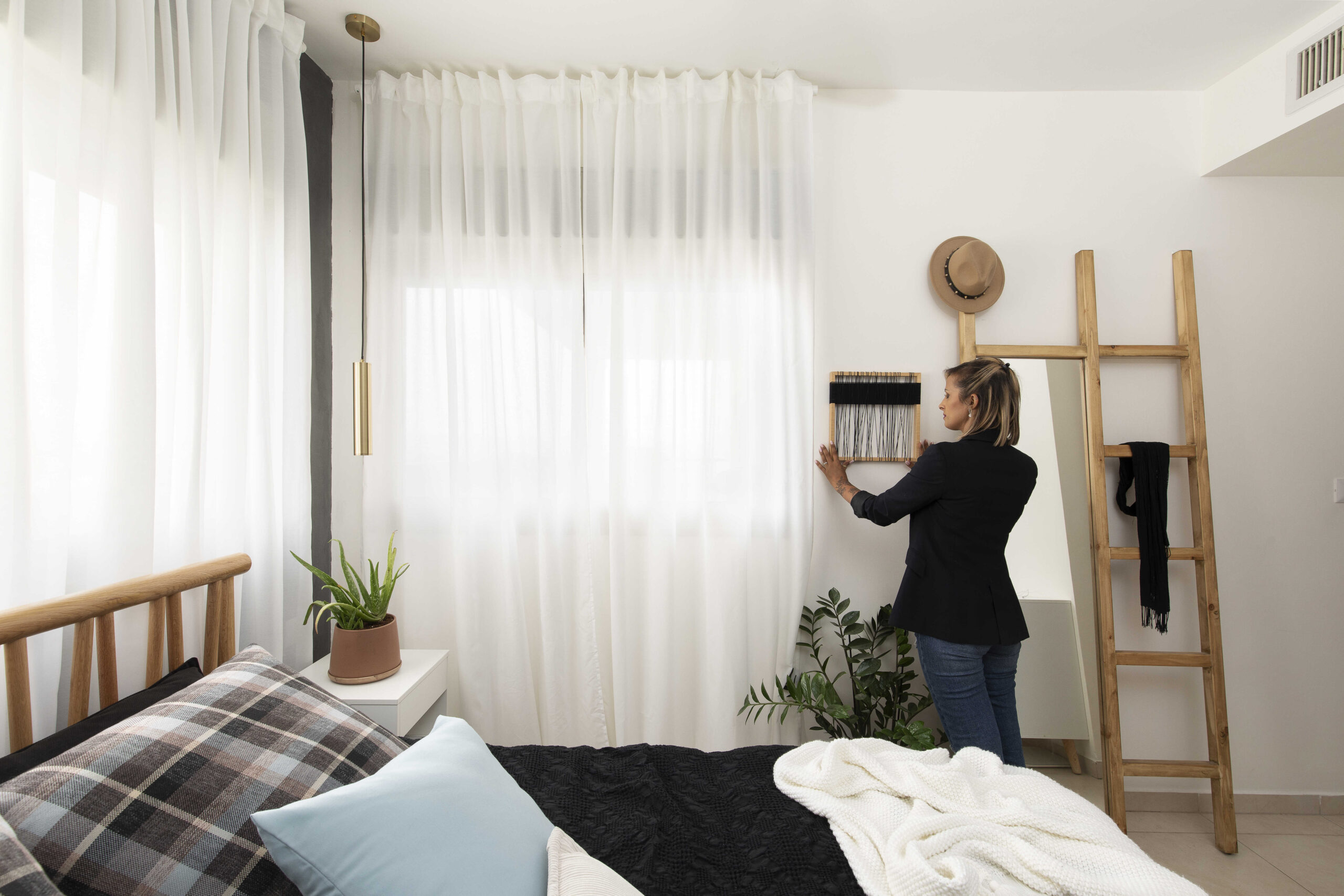 הם ביקשו חדר שינה מעט מחוספס אבל שיהיה נעים להיכנס אליו לכן לקחתי את המילה מחופספס תרתי משמע ובחרתי להם קיר גב מיטה אפור כהה בטקסטורה מחוספסת דמוי בטון אליו שילבתי אלמנטים בשחור וזהב ולכל זה הכנסתי וילון נשפך, ריהוט מעץ, כריות נוי בצבעים מעניינים, תמונות ליפופים עם קו נקי וצמחים על מנת לתת איזון לחספוס ולתת להם את ההרגשה זאת שהם ביקשו: “חדר שיהיה נעים להיכנס אליו”.